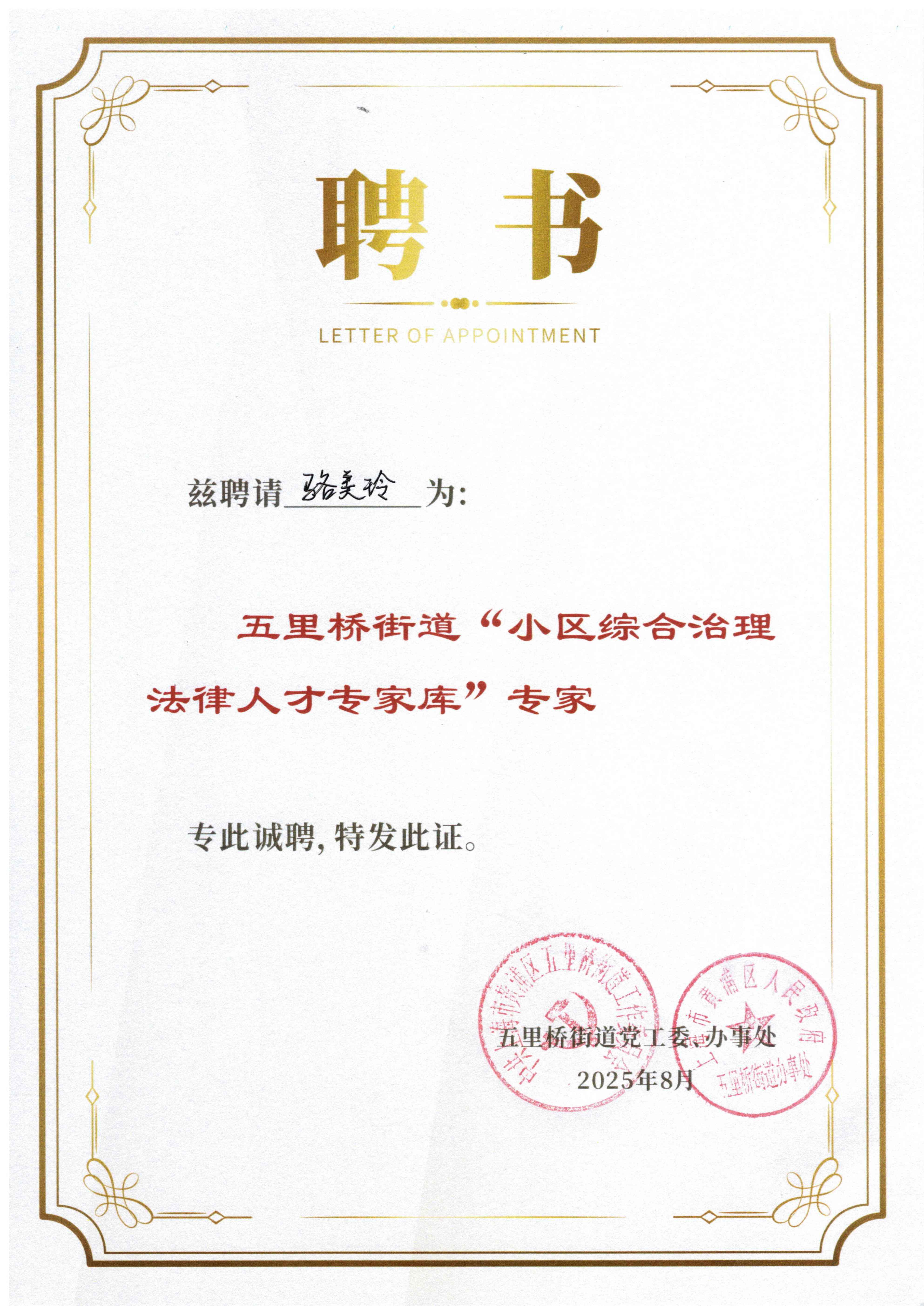 骆美玲律师被五里桥街道聘为“小区综合治理法律人才专家库”专家。我们深信,您精湛的专业能力和服务社区的热忱,必将能为破解社区治理顽疾提供关键助力,推动“法治社区”建设迈向新台阶。专此恭贺,并致谢忱!